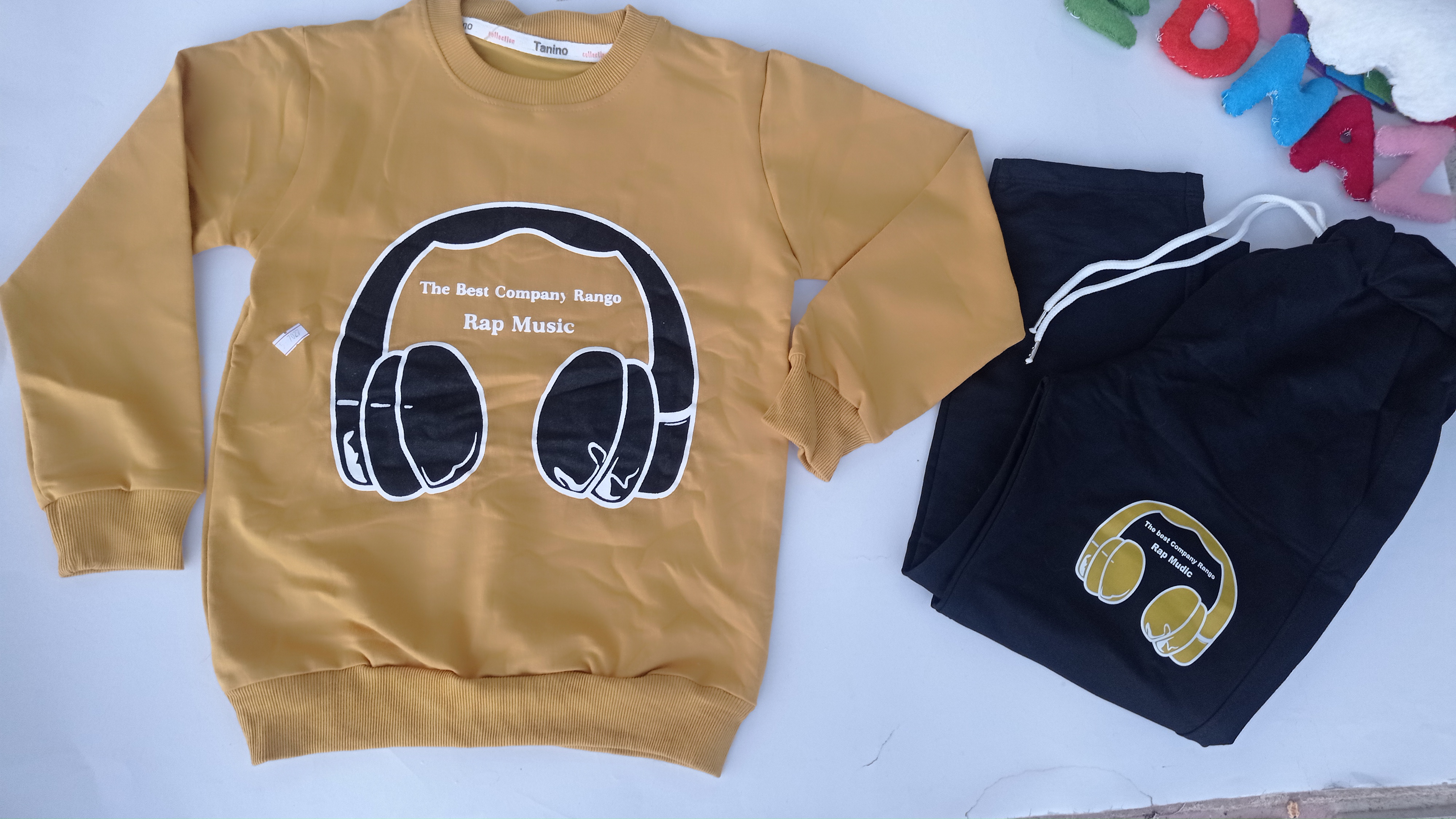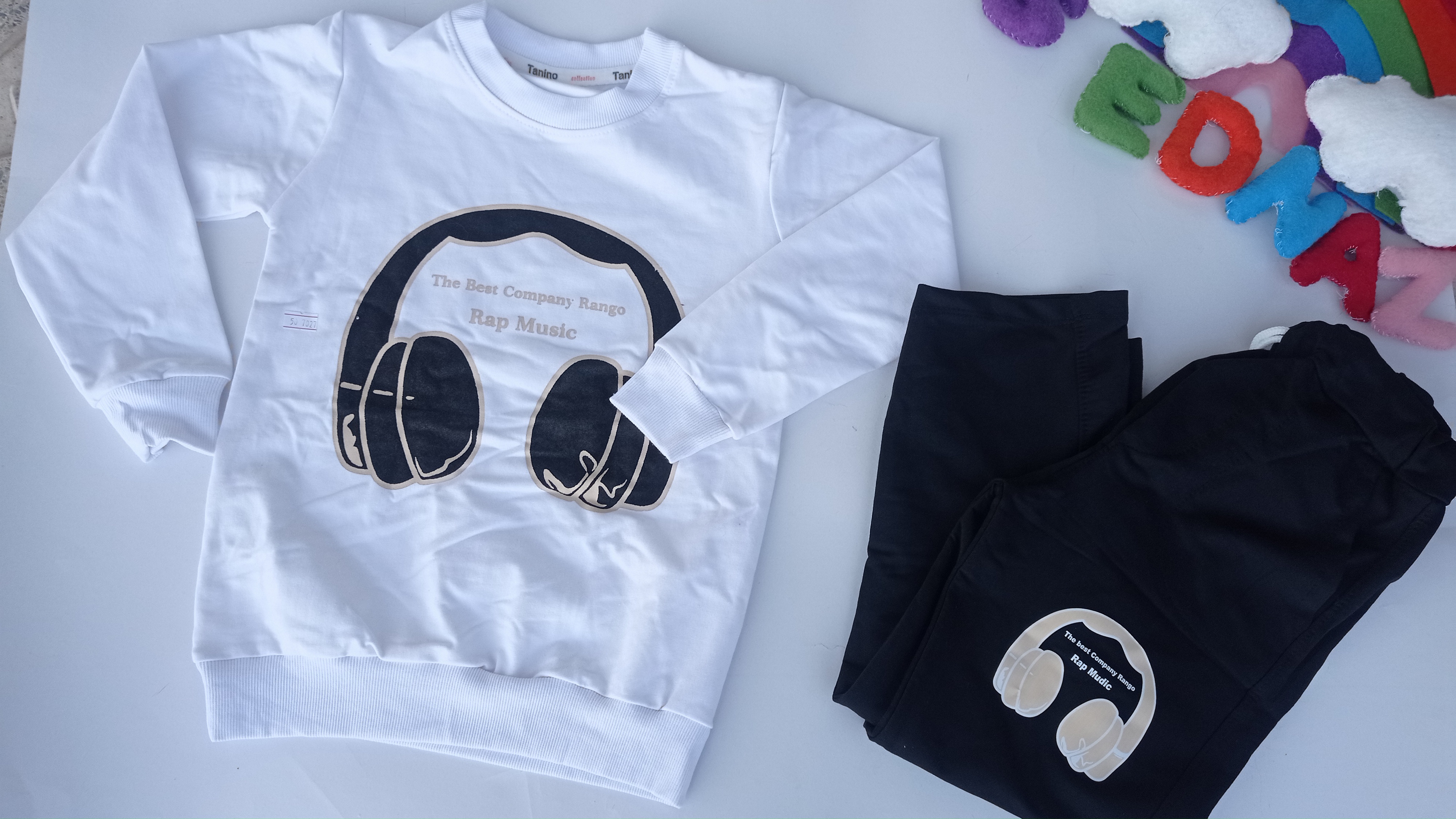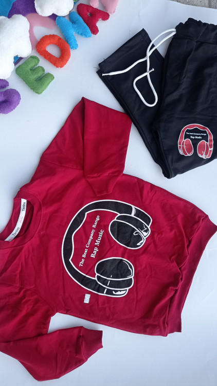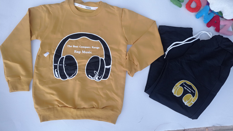 روی بلوز و روی شلوار چاپ هدفون کار شده که زیبایی لباس را چند برابر کرده