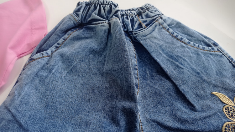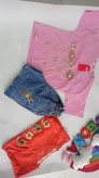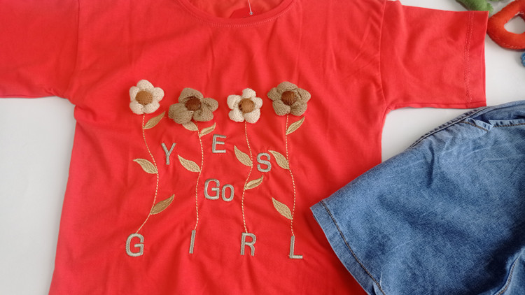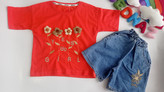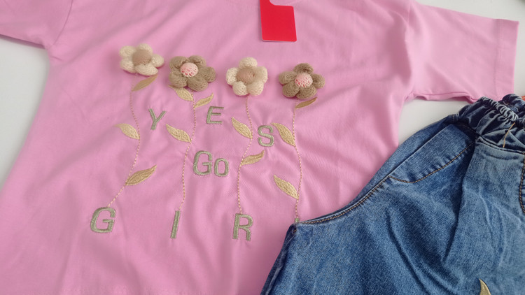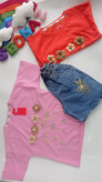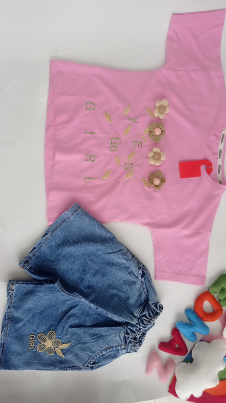 ست تیشرت و شلوارک دخترانه طرح چهار گل برجسته سوپرپنبه و شلوارک جین خوی سایزبندی45تا60